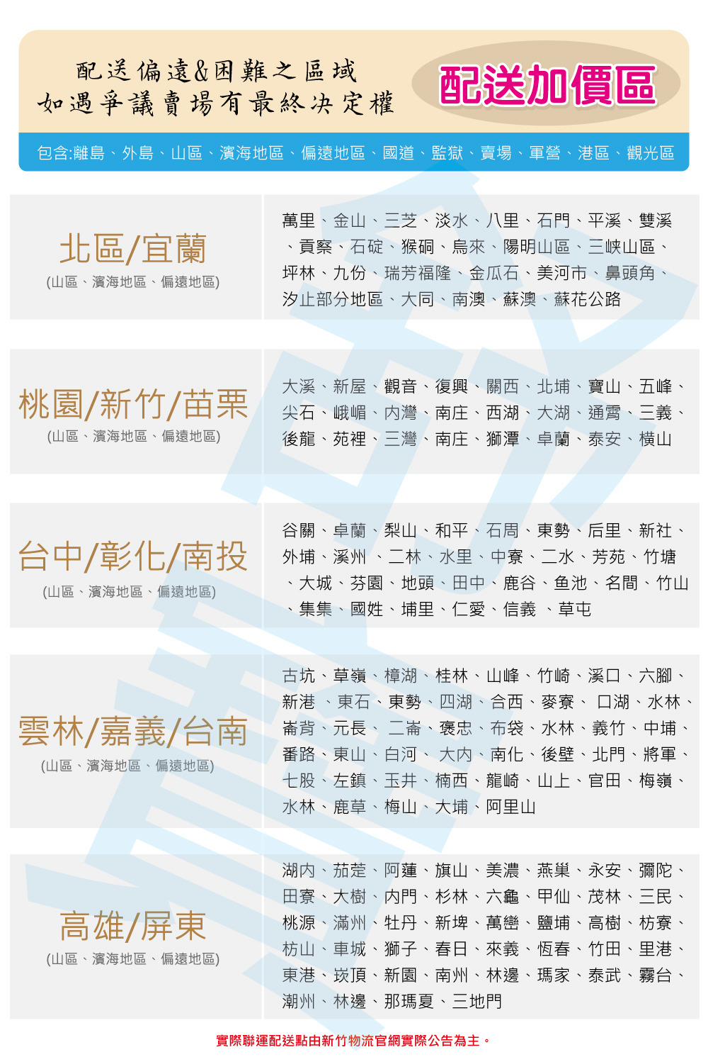 配送方式:本商品將以【宅配】寄送,僅配送台灣本島區域,預計5個工作天左右完成寄送,請務必確保您所填寫收件人資料的正確性,若因個人疏失造成無法交寄狀況,將視狀況負擔部分運費;若是留住家地址請務必確保有管理員或是家人簽收,避免延遲。